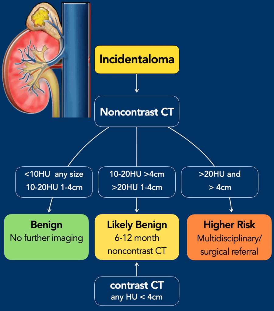 - Benign: < 10HU (any size) or 10-20HU (1-4 cm). No further imaging is needed.