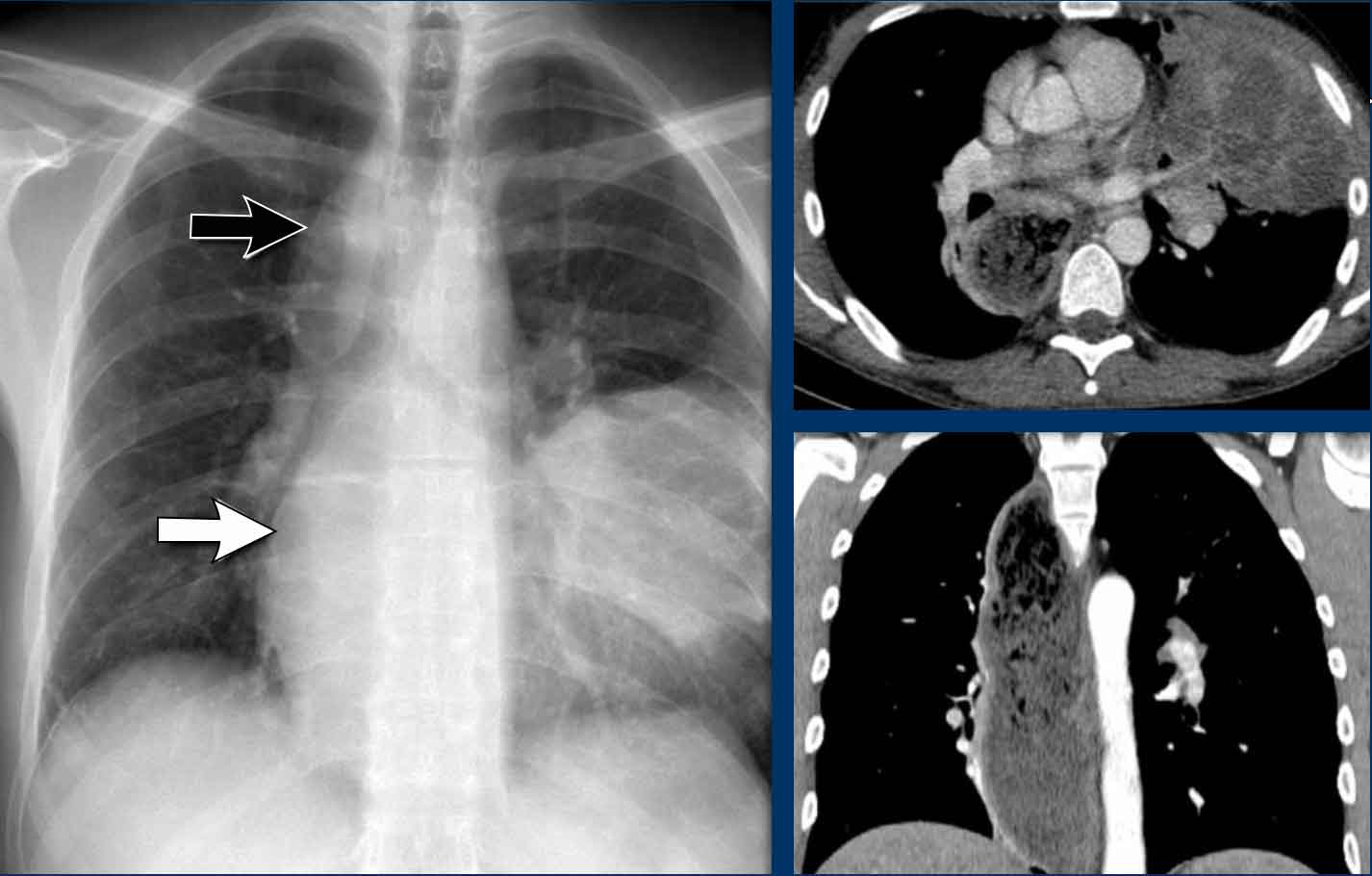 • Widening of the right paratracheal stripe (>2–3 mm) may indicate lymphadenopathy, pleural thickening, hemorrhage, fluid overload, or congestive heart failure.