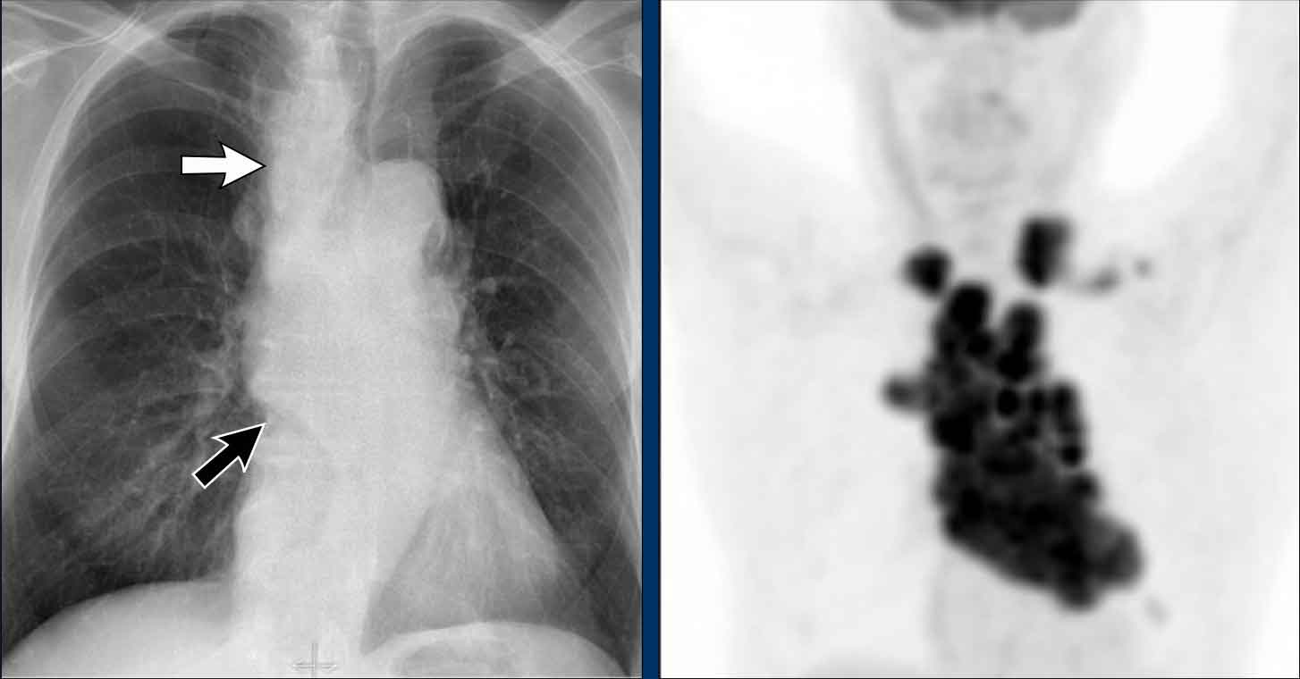 • A soft tissue density in the retrosternal space narrows the differential diagnosis to anterior mediastinal masses, commonly remembered as the "4 Ts":