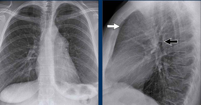 lateral chest radiograph is particularly useful in such cases to confirm the diagnosis.