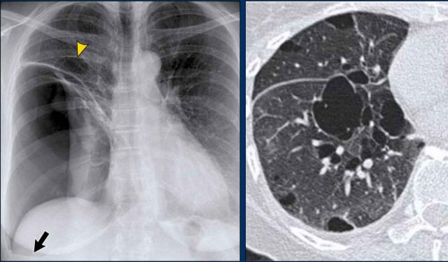 We are dealing with a woman with a cystic lung disease, who probably had prior pneumothoraces.