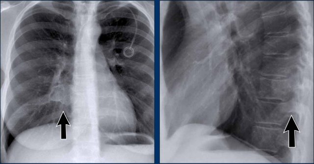 • Any opacity in the region of the vertebral bodies should prompt correlation with the PA view to assess for spondylotic osteophytes, which are typically located on the right side.